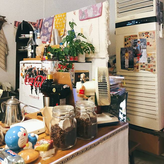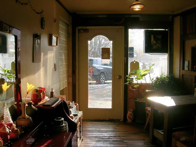 사장님 한 명이 운영하는 카페인데, 잡다하고 귀여운 물건을 모으는 것이 취미라고. 모든 공간에 빠짐없이 사장님의 손길이 닿았다. 게다가 노을 맛집이다. 노을이 질 무렵 문에 달린 작은 창문 사이로 석양빛이 들어와 내부를 은은하게 밝힌다. 카메라로 절대 담을 수 없는 감성이다.