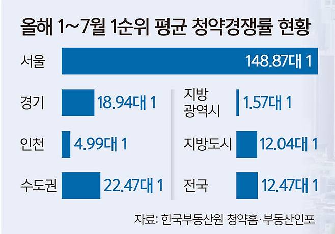 부동산인포가 부동산원 청약홈 청약 결과 자료를 분석한 결과에 따르면 올해 1∼7월 서울 평균 청약 경쟁률은 148.87대 1에 달했다. 전국 평균 청약 경쟁률(12.47대 1)이나 수도권(22.47대 1), 지방광역시(1.57대 1), 지방도시(12.04대 1) 경쟁률을 압도했다.