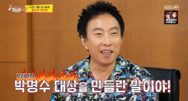 며칠 전 KBS예능센터장실을 찾은 박명수는 한경천 예능센터장, 박지영 '사당귀' CP와 만나 이야기를 나눴다. 예고없이 들이닥친 그는 "저는 대상을 꿈꾼다"고 선언했다. 전현무는 "올 겨울에 있을 연예대상을 한여름에.."라고 당황했고, 김숙은 "제가 듣기론 PD님 서른 몇분이 투표하는걸로 알고있다"며 센터장과는 관련이 없음을 전했다. 이에 박명수는 "그런데 일단 수뇌부 만나서 전체적인 분위기를 돌리려고"라고 말했다.