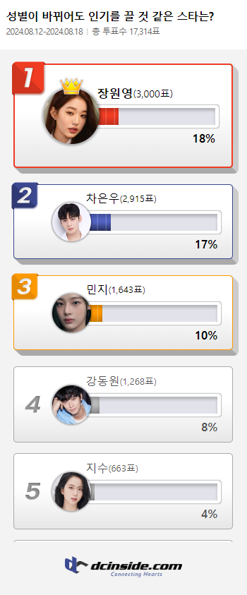 총 투표수 1만7314중 3000(18%)표로 1위에 오른 장원영은 서바이벌 오디션 '프로듀스48'에서 최종 1위를 한 이후 걸그룹 아이브로 재데뷔하며 세계적인 인기를 얻고 있다.
