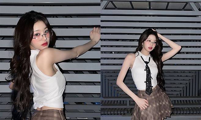 장원영은 무테 안경에 민소매 셔츠, 체크무늬 치마를 매치하여 긱시크룩을 완벽하게 소화했다.