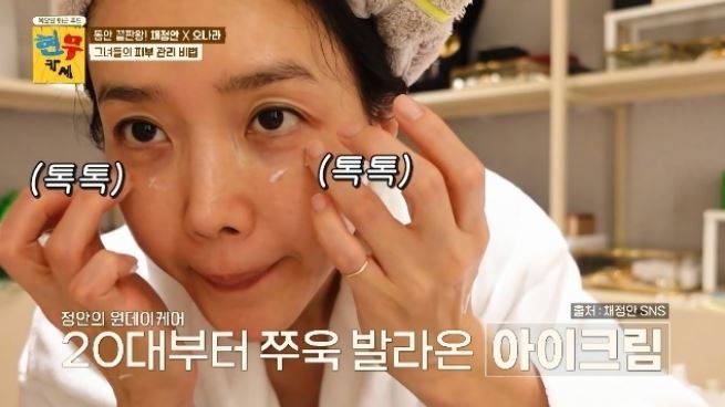 이어 채정안은 "아이크림도 바르고 괄사도 하고 디바이스도 한다. 그렇게 관리하면 피부과에서 관리 받은 걸 유지시켜주는 힘이 생기는 것 같다"라고 덧붙였다.