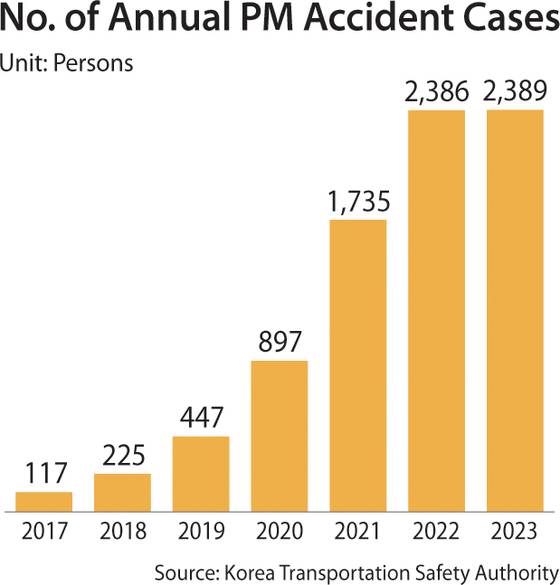 The number of reported accidents involving PM devices hit 2,389 in 2023, an approximately 20-fold increase from 117 cases in 2017, according to the Korea Transportation Safety Authority (Kotsa).