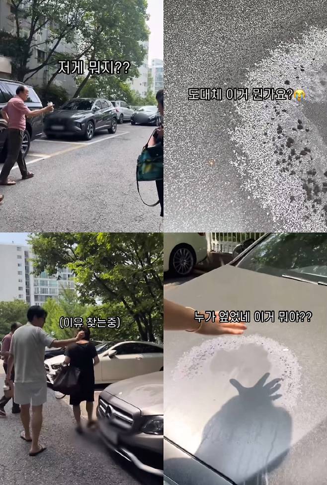"자동차 테러"라면서 공개한 영상 속에는 자동차 본네트 전체에 크고 작은 얼룩이 가득한 상황.