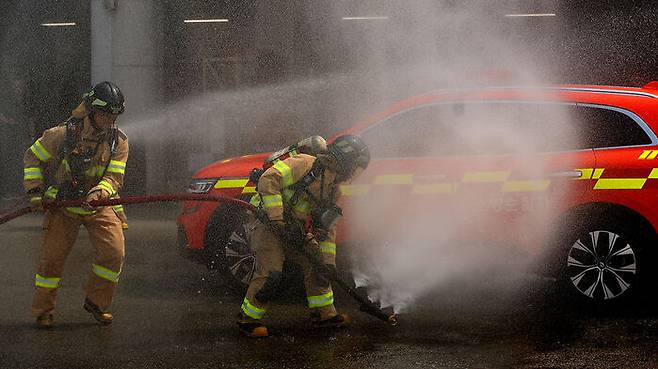 ▲ 지난 14일 부산 연제구 부산소방재난본부에서 전기차 화재 진화 시연을 하는 소방대원들