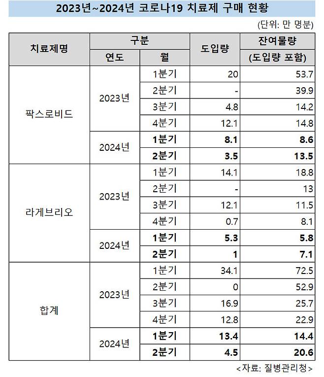 실제 질병청은 올해 상반기(1~6월) 먹는 코로나19 치료제인 팍스로비드 11만6000명분, 라게브리오 6만3000명분 등 총 17만9000명분만 도입했다. 당국은 직전 해인 2023년 상반기에는 팍스로비드 20만명분과 라게브리오 14만1000명 등 총 34만1000명을 확보했다. 올해 상반기 직전 해에 비해 절반 수준에 그치는 치료제를 확보한 것이다.