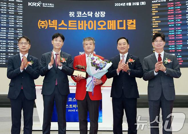 (서울=뉴스1) = 20일 서울 영등포구 한국거래소에서 열린 넥스트바이오메디컬 코스닥시장 상장기념식에서 상장기념패 전달 후 김대영 한국IR협의회 부회장(왼쪽부터), 민경욱 한국거래소 코스닥시장본부장, 이돈행 넥스트바이오메디컬 대표이사, 김성환 한국투자증권 대표이사, 김준만 코스닥협회 상무가 기념촬영을 하고 있다. (한국거래소 제공) 2024.8.20/뉴스1