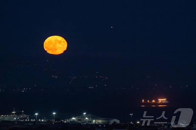 (샌프란시스코 AFP=뉴스1) 정지윤기자 = 19일(현지시간) 밤 미국 캘리포니아주 샌프란시스코만 위로 '블루 스투르전(철갑상어) 슈퍼문'이 둥실 떠올랐다. 슈퍼문은 지구와 달의 거리가 가장 가까운 때이고 블루문은 색깔과는 관계없이 한달에 두번 뜨는 보름달을 말한다. 이중 8월에 뜨는 보름달은 계절 명칭이 '철갑상어(Sturgeon)'이다. 세개의 자연 현상이 겹치는 일은 매우 희귀한 경우이다. 2024.08.20