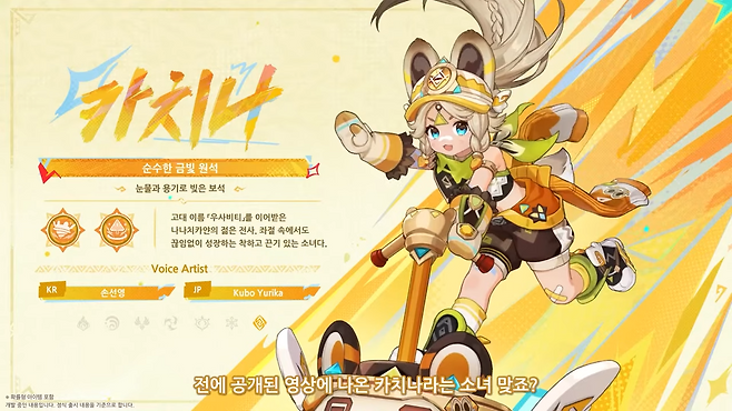 카치나는 강인함을 의미하는 고대 이름 '우사비티'를 이어받은 나나치키얀의 젊은 전사로, 4성 바위 원소 장병기 캐릭터다. 나타 마신 임무 제1막을 완료하면 동료로 바로 영입할 수 있다.