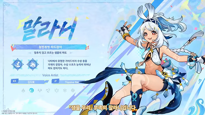 법구를 사용하는 5성 물 원소 캐릭터로 '샤크 서핑보드'를 타고 다니면서 지상과 수면에서 빠른 이동 능력을 보여준다. '샤크 서핑보드'를 타면 이동 속도와 경직 저항력이 증가하고, 수면과 액체 열소 위까지 이동할 수 있게 된다.