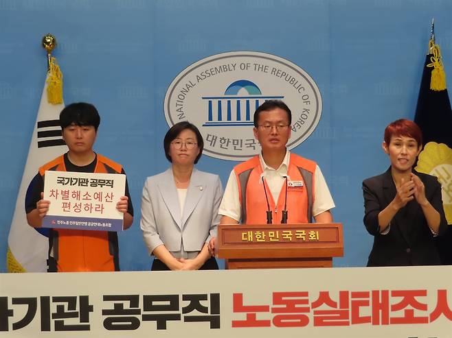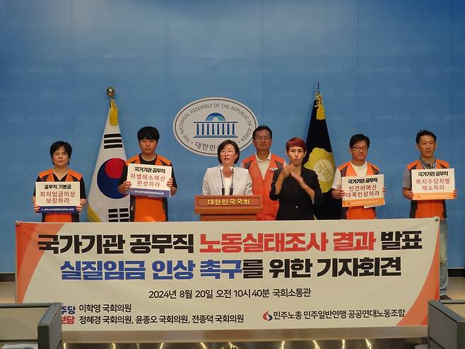 민주노총 민주일반연맹 공공연대노동조합(아래 노조)은 20일 오전 10시 40분 국회 소통관에서 이학영 더불어민주당 국회의원과 정혜경·윤종오·전종덕 진보당 국회의원과 함께 '국가기관 공무직 노동실태조사 결과 발표, 실질임금 인상 촉구를 위한 국회 기자회견'을 진행했다.