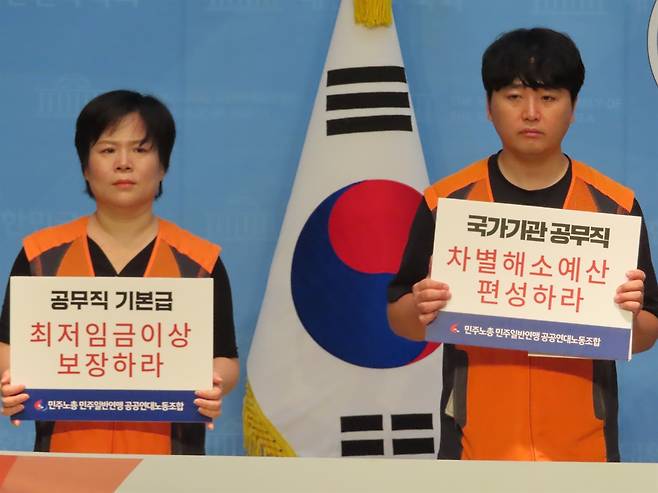 | ▲ 기자회견에 참여한 공공연대노동조합 소속 조합원들이 '공무직 기본급 최저임금 이상 보장', '국가기관 공무직 차별해소예산 편성' 등을 촉구하는 피켓을 들고 있다. |
