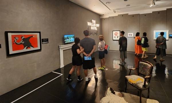 | ▲ 서울 종로구 인사동 그라운드서울에서 열리고 있는 뱅크시 전시회. 왼쪽 작품이 뱅크시의 대표작으로 꼽히는 ‘꽃을 던지는 사람’이다. |