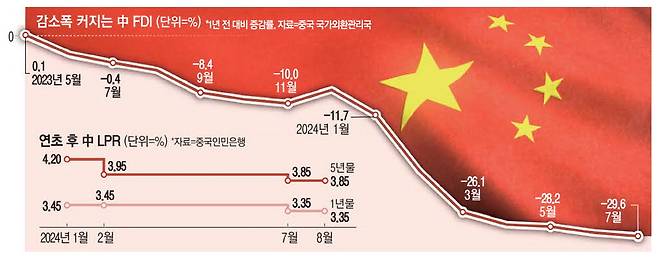 특히 리 총리의 발언은 중국 내 외자 유출이 갈수록 빨라지고 있다는 점과 연관이 깊다. 지난달 중국 외국인직접투자(FDI)는 지난해 동기보다 29.6% 감소했다. 지난 6월(-29.1%)보다 감소폭이 더 커진 것으로, 글로벌 금융위기 때인 2009년 1월(-32.6%) 이후 최저치다. 중국 FDI는 지난해 6월 마이너스로 돌아선 뒤 14개월 연속 하락폭을 키우며 감소세를 이어가고 있다.