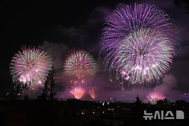 [부다페스트=AP/뉴시스] 헝가리 건국기념일인 20일(현지시각) 부다페스트 상공에서 축하 불꽃이 터지고 있다. 헝가리는 매년 8월 20일 건국을 기념하고 초대 국왕인 성 이슈트반 1세를 기린다. 2024.08.21.
