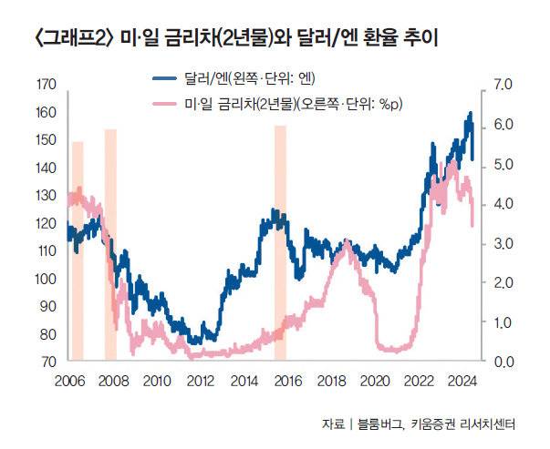 향후 달러/엔 환율의 방향성에서 주요 변수는 미국 연준의 통화정책과 이에 따른 미 국채금리 흐름이 될 전망이다. 이는 일본은행이 통화정책회의에서 추가적인 긴축 조치를 내놓기는 쉽지 않을 것이라는 점에 기인하는데, 대외 수요에 대한 불확실성이 점증하고 있고 실질 급여의 상승세 지속 여부 등 경기와 물가 흐름을 좀 더 지켜볼 필요가 있기 때문이다. 연준의 정책금리 인하폭은 올해 하반기에 더 확대될 수 있겠으나, 인플레이션을 고려할 때 과거처럼 대폭 확대되기 어려운 상황에 비춰 미·일 금리차 축소에 따른 급격한 엔화 강세 우려는 낮출 필요가 있다.