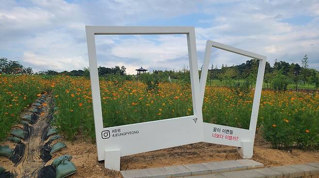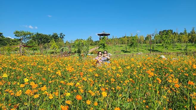 황화코스모스가 만드는 황금빛 물결을 배경으로 사진을 찍을 수 있는 포토존도 곳곳에 설치돼 있어 기념사진도 남길 수 있습니다.