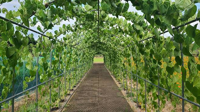 증평군 농심테마파크에 조성된 수세미, 여주, 하늘마, 단호박으로 꾸며진 허브랜드 터널은 보는 재미와 함께 시원한 그늘을 제공합니다.