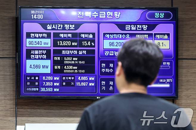 21일 오후 서울 중구 한국전력 서울본부 1층에 설치된 모니터에 전력수급현황이 나타나고 있다. 2024.8.21/뉴스1