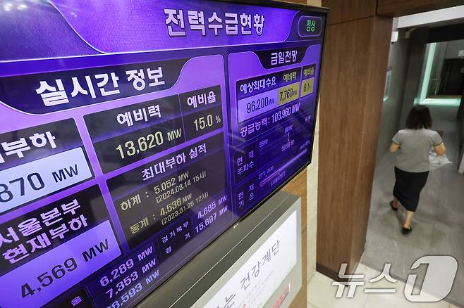 21일 오후 서울 중구 한국전력 서울본부 1층에 설치된 모니터에 전력수급현황이 나타나고 있다. 2024.8.21/뉴스1