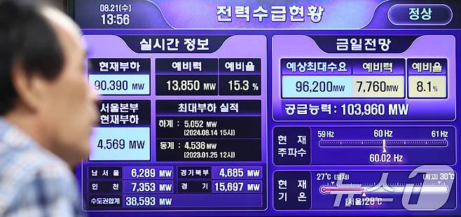 21일 오후 서울 중구 한국전력 서울본부 1층에 설치된 모니터에 전력수급현황이 나타나고 있다. 2024.8.21/뉴스1