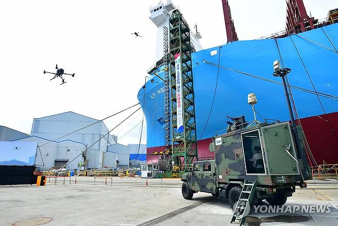 (울산=연합뉴스) HD현대중공업 울산조선소에서 21일 '2024년 을지연습'으로 드론 테러 대응훈련이 진행되고 있다. 2024.8.21 [HD현대중공업 제공. 재판매 및 DB 금지]