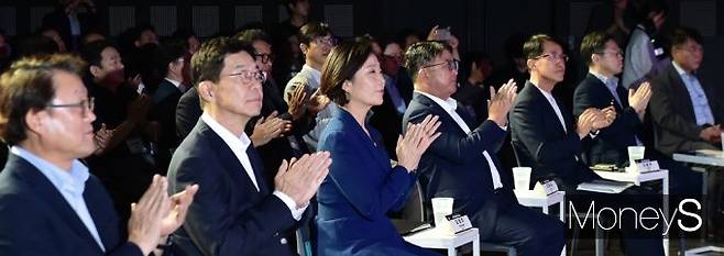 오영주 중소벤처기업부 장관을 포함한 주요기업 임원들이 21일 서울 삼성동 코엑스 스튜디오119에서 진행된 '딥테크 밸류업 프로그램' 론칭 행사에 참석, 박수를 치고 있다.