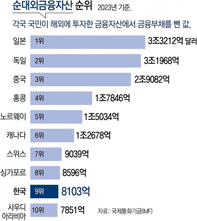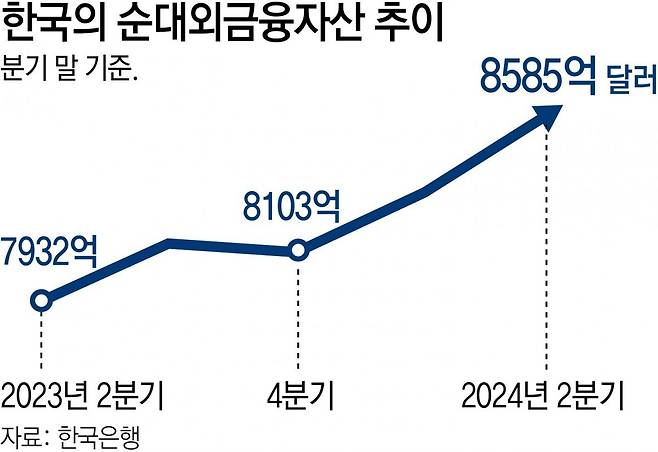 순대외금융자산이 ‘플러스(+)’를 기록한 것은 외국인이 우리나라에 투자한 금융자산보다 국내 개인 및 기관 투자가가 해외에 투자한 금액이 많다는 의미다. 2014년 809억 달러로 처음으로 플러스를 기록한 순대외금융자산은 10년 만에 10배 이상으로 증가했다. 국제통화기금(IMF)에 따르면 지난해 기준 한국의 순대외금융자산 규모는 세계 9위였다.