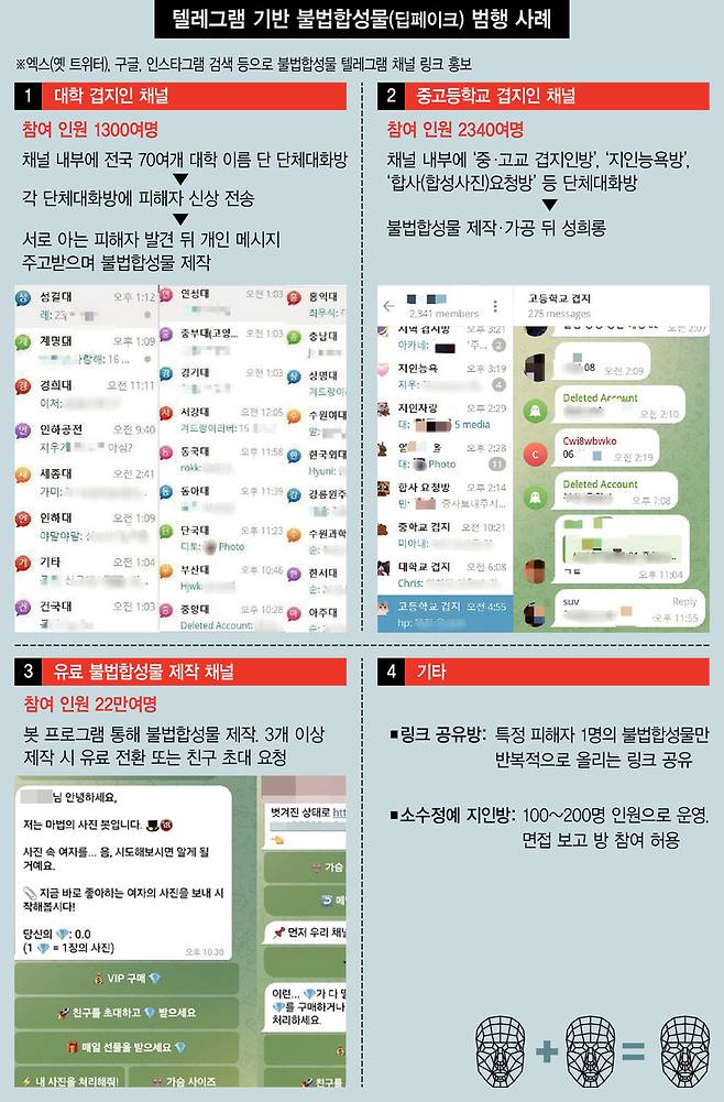 심지어 중고교생을 대상으로 하는 불법합성 텔레그램 채널에도 2340여명이 참여하고 있었다. 이 채널에선 단순 소지와 시청만 하더라도 1년 이상의 징역에 처할 수 있는 ‘미성년자 불법합성물’이 지속해서 제작·유포됐다.