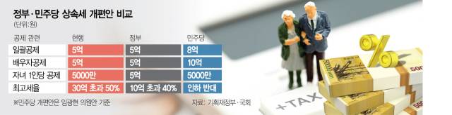 민주당이 정부와 마찬가지로 상속세 면제 한도를 높이는 세법 개정안을 발의하기로 한 것도 중산층 부담 완화라는 취지 때문이다. 민주당 관계자는 “중산층의 세 부담을 덜어줘야 한다는 인식이 강하다”고 밝혔다.