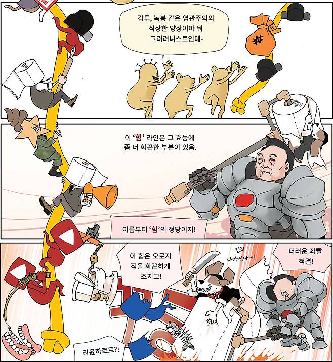 〈시사IN〉 대표 콘텐츠. 시사와 ‘서브컬처’라는 생소한 조합을 선보여 수많은 마니아층을 거느린 굽시니스트가 선보이는 통쾌·유쾌·상쾌 시사만화입니다.