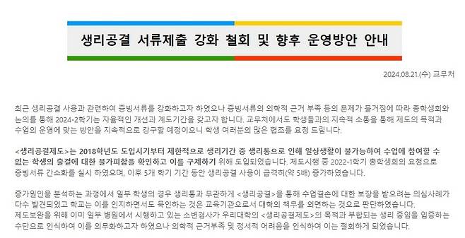 | ▲ 서울예대가 지난 12일 홈페이지에 게시한 생리 공결 증빙서류 강화 안내. |