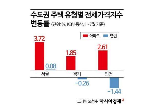 빌라를 포함한 연립 전세보다 아파트 전세를 선호하는 현상은 서울을 포함한 수도권 전체에서 공통적으로 나타났다. 주택 유형별로 전세가격지수 변동률(1월 대비 7월)을 살펴보면 아파트는 서울(3.72%)·인천(2.61%)·경기(1.85%)에서 일제히 상승했다. 반면 연립은 뒷걸음질 쳤다. 특히 대규모 전세 사기 사건이 터졌던 인천의 경우 연립 전세가격지수는 1.44%나 떨어졌다. 경기도(-0.26%)도 하락했고, 서울은 보합(0.08%) 수준이었다.