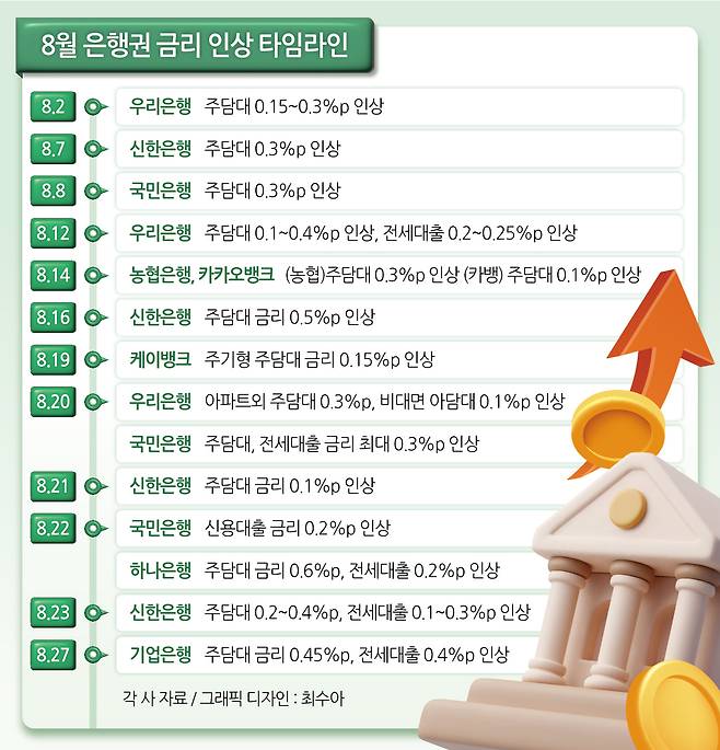 은행들이 속속 금리를 올리며 가계부채 증가에 대응하고 있지만, 큰 효과는 보지 못하고 있는 것이다. 당장 이날 우리은행은 약 한 달여만에 6번째로 주담대 금리를 0.1~0.4%포인트, 전세대출을 0.2~0.6%포인트 인상했다. 신한은행은 전날 약 40여일만에 7번째 금리 인상을 단행하며 주담대 금리를 최대 0.4%포인트, 전세자금대출은 0.3%포인트 상향조정했다. 지난 7월부터 이날까지 5대 시중은행, 그리고 인터넷전문은행이 금리를 인상한 횟수는 총 20차례가 넘는다.