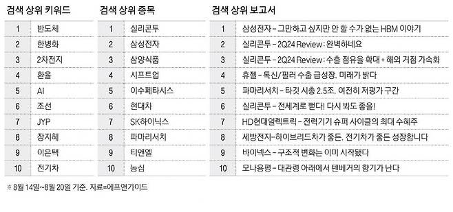 키워드 검색 순위에서는 '부동의 1위'인 반도체가 또다시 최상위 순위를 차지했고, 최근의 전기차 화재 사건 관련 리포트를 낸 한병화 유진투자증권 연구원이 2위였다.