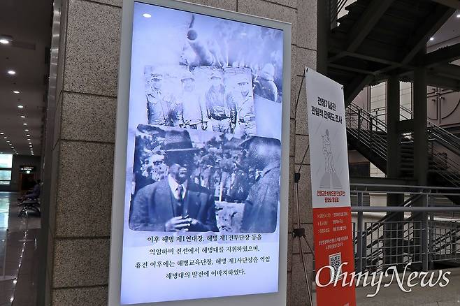 이날 찾은 전쟁기념관에서 독도 조형물이 전시돼 있던 공간엔 디지털 전광판이 놓여 있었고 '8월의 호국 인물 김성은 중장'을 소개하는 영상이 반복 재생되고 있었다. 영상에는 이승만 전 대통령이 1954년 1월 4일 해병대 제2연대 창설 현장을 방문한 모습도 담겼다.