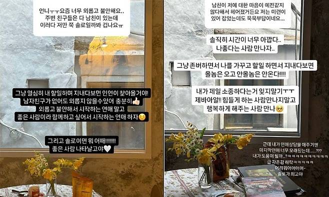 율희는 "내가 제일 소중하다는 거 잊지 말기, 제발 힘들게 하는 사람 만나지 말고 행복하게 해주는 사람 만나", "마지막 연애 너무 오래됐는데 내가 도움이 될까? 솔로가 최고야"라고 덧붙였다.