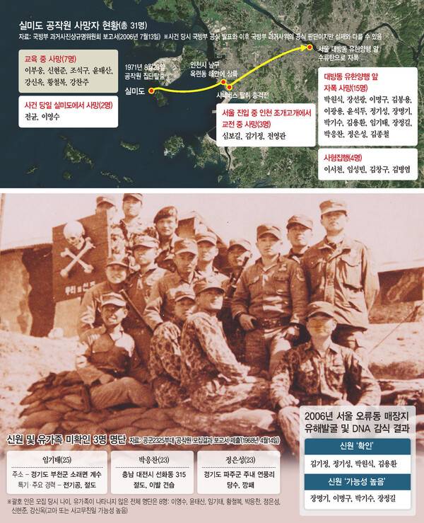 오는 23일은 실미도 사건이 발생한 지 53년이 되는 날이다. 그날 김일성 암살을 위해 극비리에 만든 특수부대의 공작원들은 섬을 빠져나와 시내버스를 탈취하고 서울 청와대로 진격하다 자폭했다. 반세기 만인 오는 9~10월께 국방부 장관은 이 사건과 관련해 유족들에게 사과한다. 사과는 경기도 벽제리 공동묘지에서 열리는 사형집행자 유해발굴 개토제 때 ‘국방부 간부의 대독’ 방식으로 이뤄진다. 국방부 쪽은 사과 내용에 대해서는 “큰 틀에서”라고 밝혔지만, 모호하고 형식적인 수준일 가능성이 크다. 실미도 사건은 불법 모집에서부터 훈련 중 인권침해, 부식비 횡령, 사형집행 및 암매장 등 처음부터 끝까지 최악의 국가범죄였다. 만약 사망이 확인되지 않은 사람이 있는데 모조리 사망한 것으로 발표했다면 이 역시 사과해야 할 범죄에 해당한다. 한겨레는 실미도 사건 53주년과 국방부 장관의 사과 발표를 앞두고 아직 완전히 밝혀지지 않은 ‘공작원(훈련병) 생존설’에 대해 집중적으로 살펴보았다.