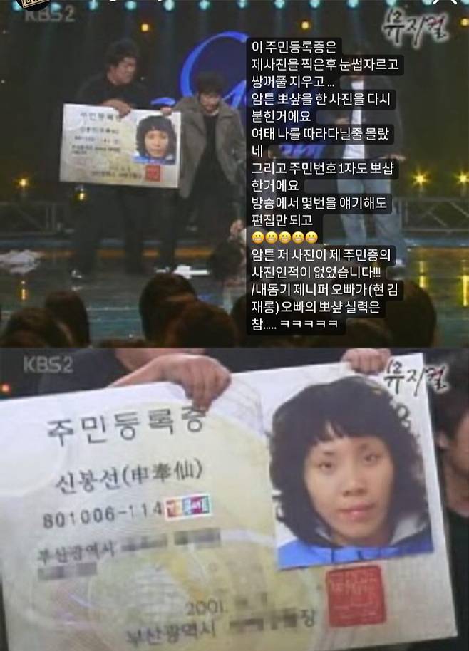 지난 2006년 KBS2 '개그콘서트'의 '뮤지컬' 코너에서 신봉선의 주민등록증 사진이 공개돼 화제를 모았던 바. 시청자들에게 폭소를 안겼던 사진은 사실 김재롱의 손을 거쳐 합성, 재탄생됐던 것이었다. 이후 해당 사진이 신봉선의 실제 주민동록증 사진인 것처럼 누리꾼들 사이 화제가 됐다. 18년이나 '성형 인증' 등의 수식어를 달고 주목을 받자 신봉선은 직접 해명한 것으로 보인다.