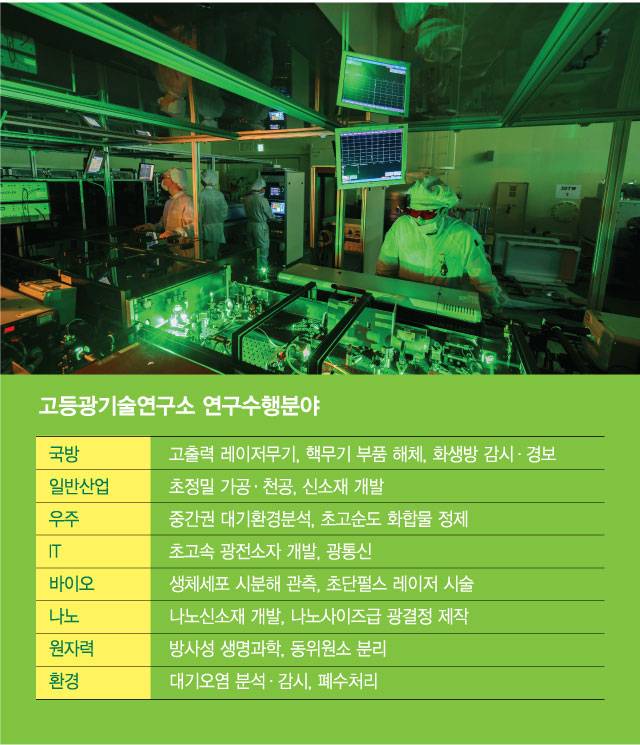 GIST(광주과학기술원)의 고등광기술연구소는 미래전의 판도를 바꿀 광선포 등에 쓰이는 레이저를 전문적으로 연구하는 곳이다. 순간출력 4PW(페타와트·1PW=1000조W)의 초강력 레이저 시설을 보유한 곳으로 광(光)과학·기술분야 교육 및 연구·개발기관으론 국내에서 유일한 곳이다. 2001년 5월 개소했다.
