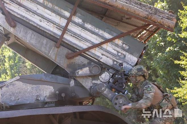 [쿠르스크=AP/뉴시스] 21일(현지시각) 러시아 국방부가 공개한 사진에 러시아 쿠르스크주 국경 지역에서 러시아 군인이 우크라이나 진영을 향해 122㎜ 방사포를 겨누고 있다. 2024.08.23.
