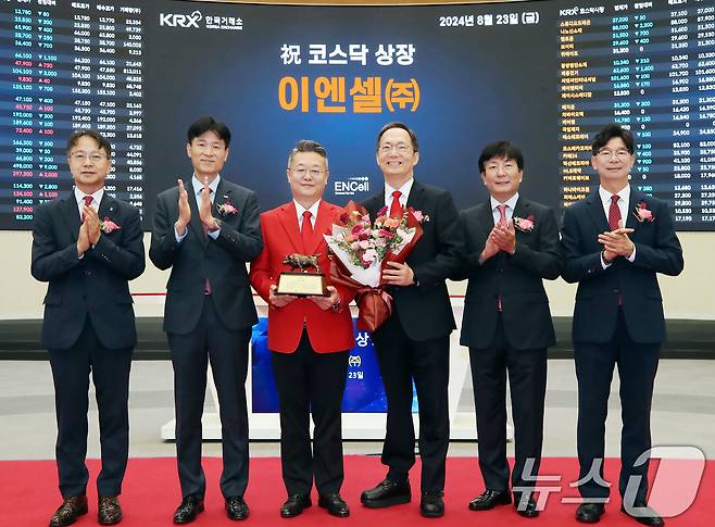 (서울=뉴스1) = 23일 오전 서울 영등포구 한국거래소에서 열린 이엔셀 코스닥시장 상장기념식에서 김대영 한국IR협의회 부회장(왼쪽부터), 민경욱 한국거래소 코스닥시장본부장, 장종욱 이엔셀 대표이사, 박승우 삼성서울병원 병원장, 이성 NH투자증권 IB1사업부 대표, 김준만 코스닥협회 상무가 기념촬영을 하고 있다. (한국거래소 제공) 2024.8.23/뉴스1
