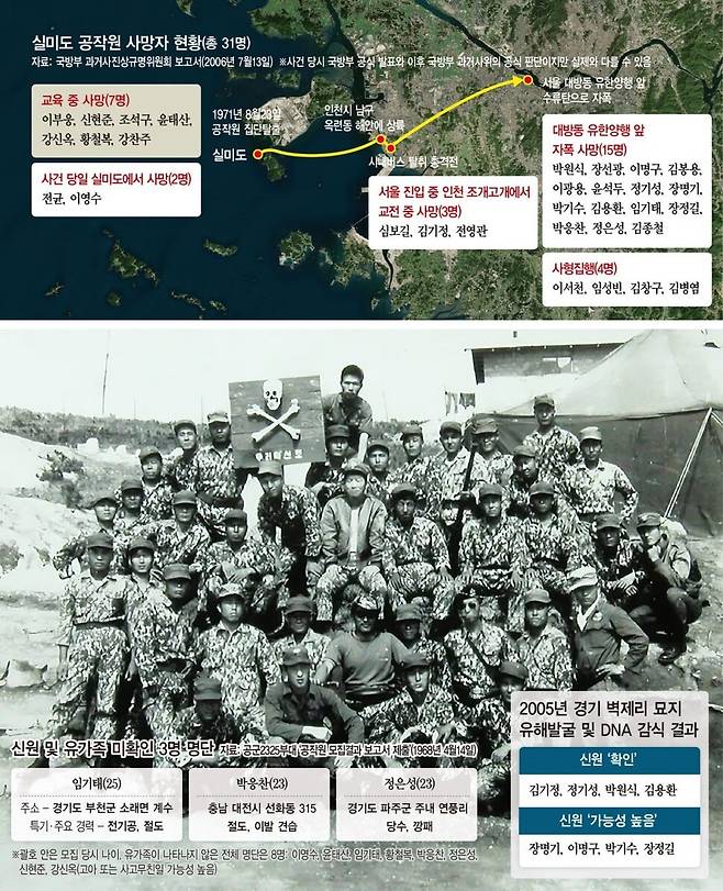 23일은 실미도 사건이 발생한 지 53년이 되는 날이다. 그날 김일성 암살을 위해 극비리에 만든 특수부대의 공작원들은 섬을 빠져나와 시내버스를 탈취하고 서울 청와대로 진격하다 자폭했다. 반세기 만인 오는 9~10월께 국방부 장관은 이 사건과 관련 유족들에게 사과한다. 사과는 경기도 벽제리 공동묘지에서 열리는 사형집행자 유해발굴 개토제 때 ‘국방부 간부의 대독’ 방식으로 이뤄진다. 국방부 쪽은 사과 내용에 대해서는 “큰 틀에서”라고만 밝혔지만, 모호하고 형식적인 수준일 가능성이 크다. 실미도 사건은 불법 모집에서부터 훈련 중 인권침해, 부식비 횡령, 사형집행 및 암매장 등 처음부터 끝까지 최악의 국가범죄였다. 만약 사망이 확인되지 않은 사람이 있는데 모조리 사망한 것으로 발표했다면 이 역시 사과해야 할 범죄에 해당한다. 한겨레는 실미도 사건 53주년과 국방부 장관의 사과 발표를 앞두고 아직 완전히 밝혀지지 않은 ‘공작원(훈련병) 생존설’에 대해 집중적으로 살펴보았다.