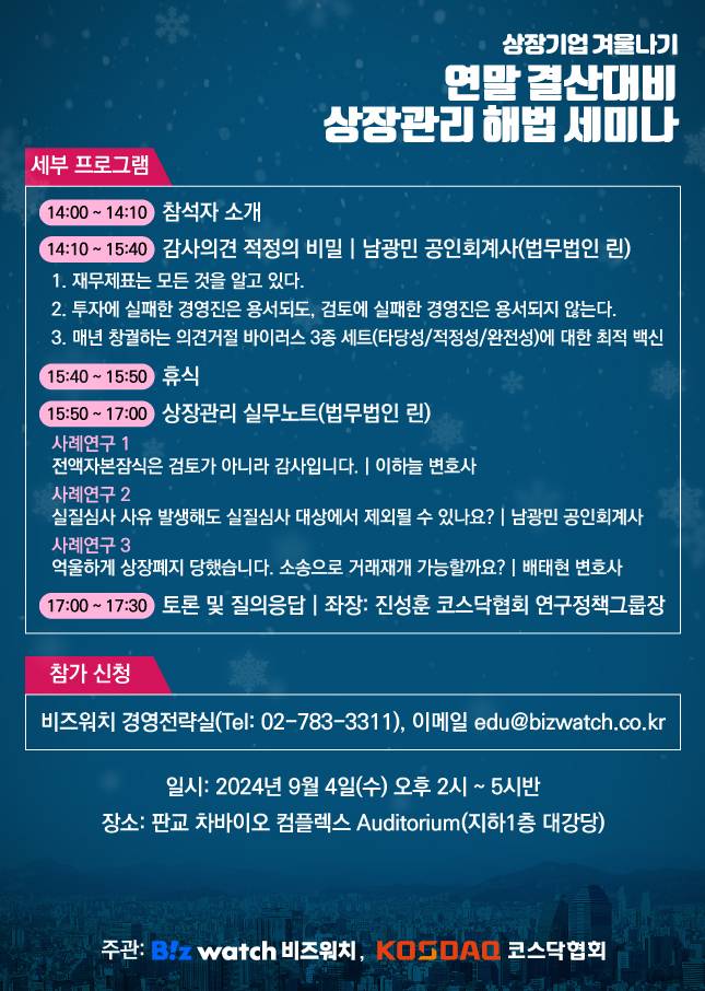 9월 4일(수) 오후 2시 경기 판교 차바이오컴플렉스 대강당에서 열리는 [상장기업 겨울나기]-연말 상장관리 해법 세미나를 들어보세요. 비즈워치와 코스닥협회가 주관하는 이번 세미나는 상장회사 관계자라면 누구나 무료로 참석 가능합니다. 비상장회사 재무 담당자도 환영합니다.