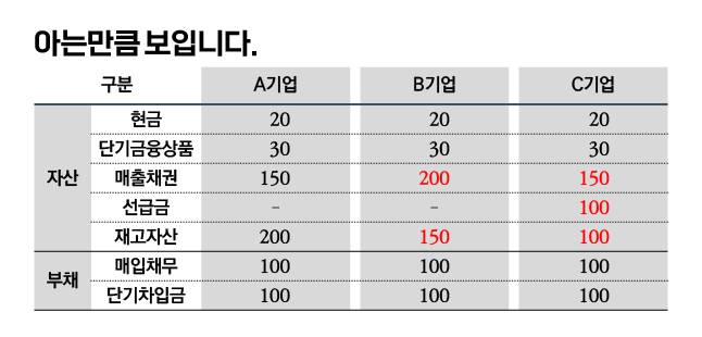 문제1: 아래 기업 중 현금유동성이 가장 좋은 곳은 어디일까요? (객관식)