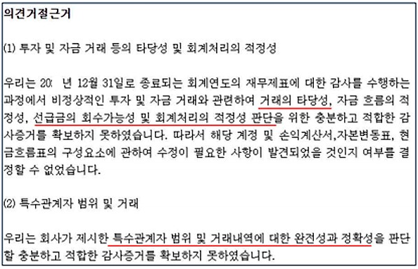 유가증권 상장사는 외부감사인의 감사의견이 '감사범위 제한에 따른 한정'이면 관리종목으로 지정, 부적정 또는 의견거절은 상장폐지 대상입니다. 감사의견 한정도 2년 연속이면 상장폐지 사유이고요.