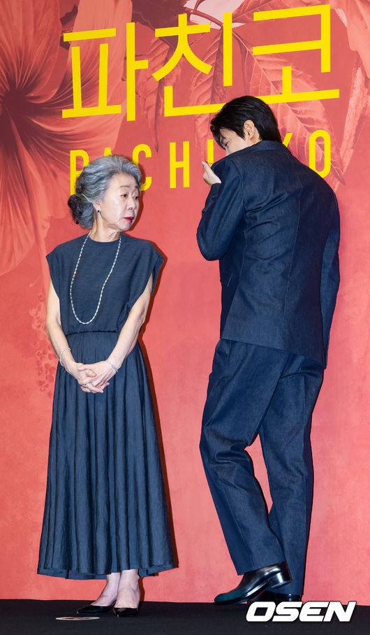 기자간담회 중 계속 기침을 했던 배우 이민호가 단체 포토타임때 윤여정을 피하고 있다. 2024.08.23 / rumi@osen.co.kr