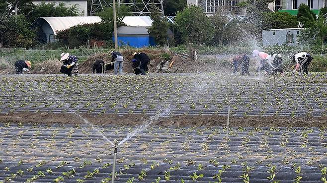 ▲ 강원 동해안에 가뭄이 계속되는 가운데 22일 강릉시 송정동 들녘에서 스프링클러가 배추밭에 물을 뿌리는 모습