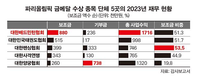 또 지난해 총수익에서 보조금이 차지하는 비중을 보면 배드민턴협회가 51.3%를 기록했다. 양궁협회(19.8%)와 사격연맹(44.9%)에 비하면 높고, 태권도협회(51.7%)와 펜싱협회(53.5%)보다는 낮다. 2022년에는 배드민턴협회 보조금 비중이 59.8%로 5개 단체 중 가장 높았다. 그해 보조금은 77억원으로 역시 최고 액수로 집계됐다.