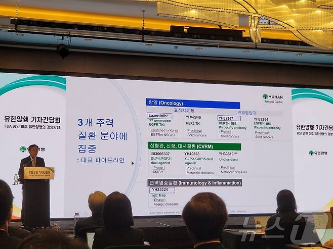 유한양행은 가장 잘할 수 있는 분야에 집중해서 R&D를 진행할 방침이다. 3개 주력 질환 분야는 암, 심혈관·신장·대사질환, 면역염증질환 등이다. 주요 파이프라인은 이중항암항체 'YH32367', 대사 이상 관련 지방간염(MASH) 후보물질 'BI3006337'·'YH40863', 'YH33619',알레르기 치료제 'YH35324' 등이다.